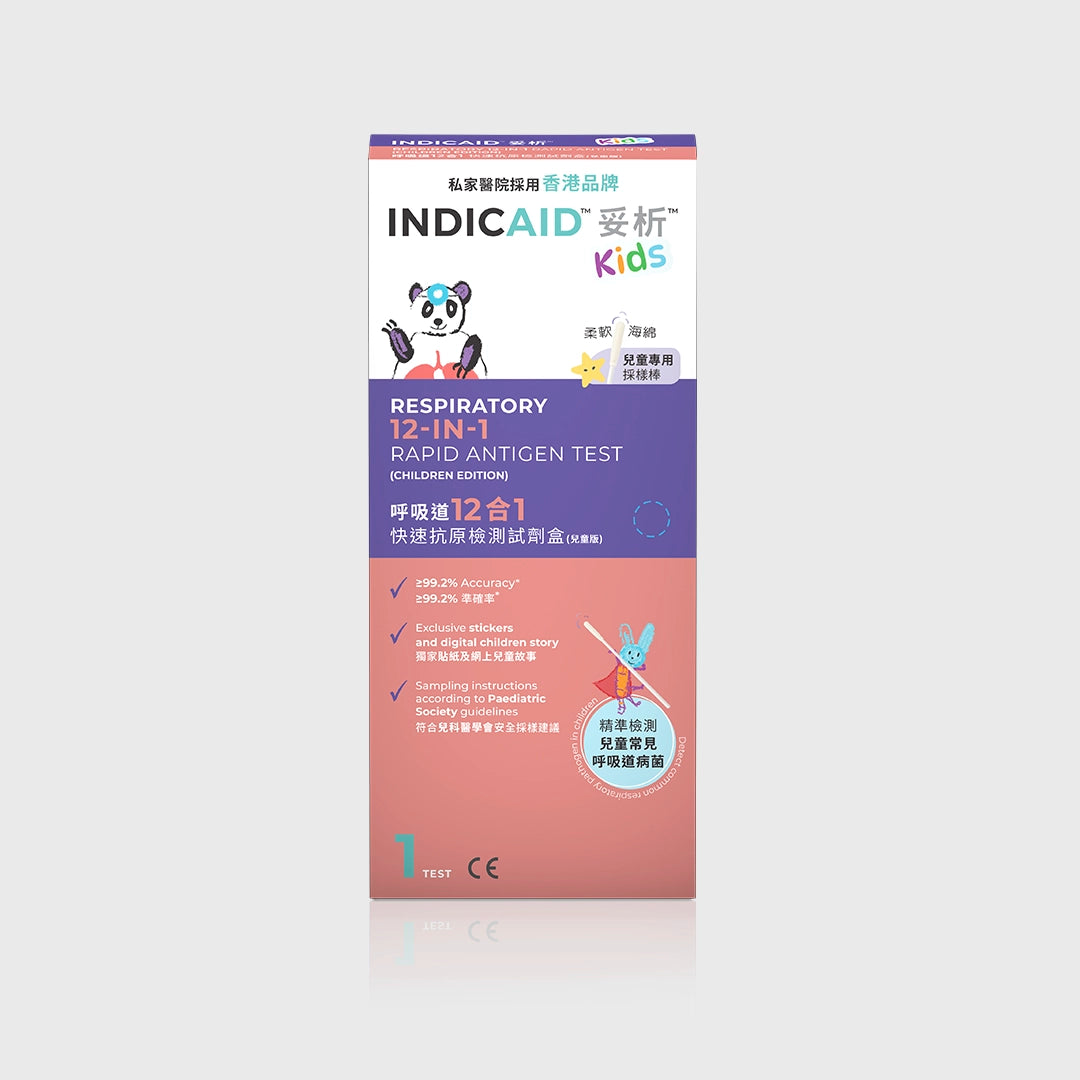 INDICAID妥析6合1快速測試【兒童版】為兒童特別設計的專屬快測,可令小朋友容易接受檢測。減低父母的煩惱,而且較其他品牌準確8倍,能快速精準檢測出病徵相似的病菌,更好把握感染後用藥黃金時間,減低重症風險。