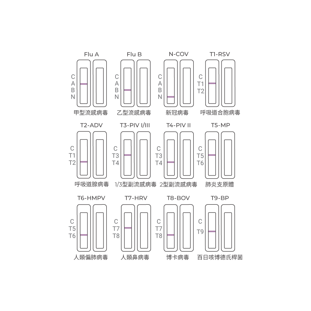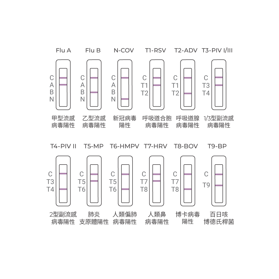 若能⾒到‘C’線,而‘A’、‘B’、‘N’、‘T1’至‘T9’ 線旁出現的任何微弱線均被視為陽性結果。